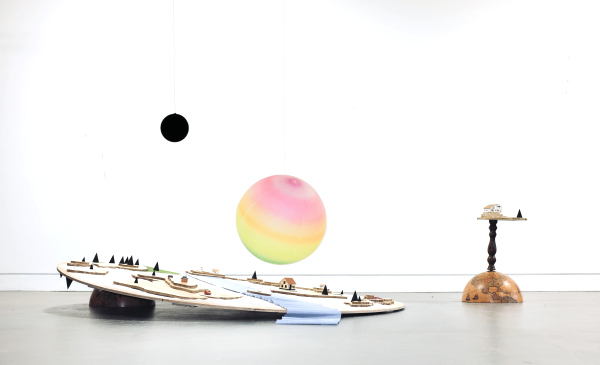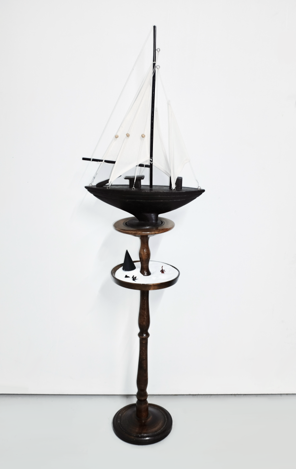 The final section of the exhibition unfolds with Qi Baiting’s Tradewind. The small boat seems to set sail from the imagined route recorded in Qin Ni’s Logbook, following unseen currents toward the depths of the gallery. At the far end of the space, the installation Timefinder opens into a rearranged miniature landscape: wooden terrains, rivers, and scattered small buildings—constructed with reference to the artist’s hometown—move slowly in motion. Within this scaled-down world, time no longer advances according to a single standardized measure, but is instead re-perceived and reoriented through local experience and natural rhythms.