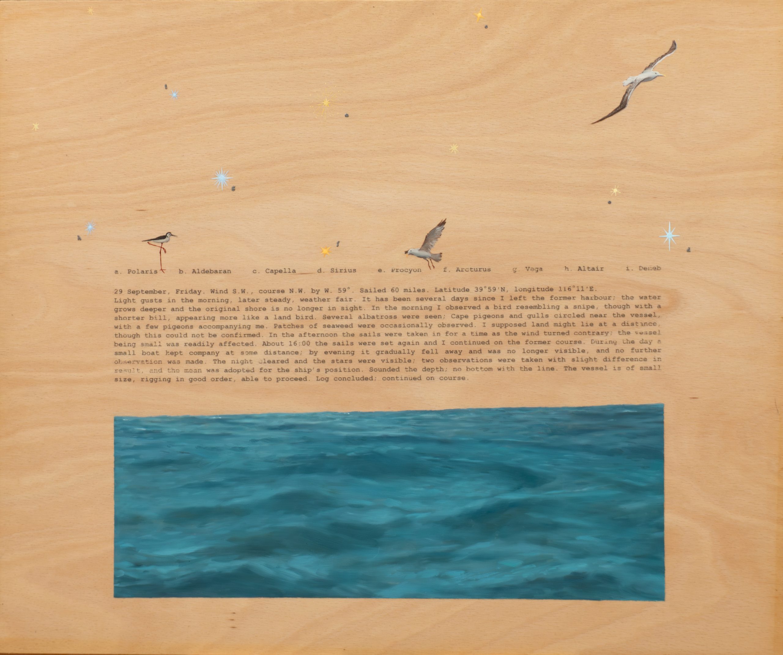 Ahead are three works by Qin Ni. She organizes images into a structure resembling a knowledge system, using the Dewey Decimal Classification as the basis for her titles, so that each piece appears like an archived entry within a catalog. In 521.11 Polarization Notes—The Third Movement of the Flock, a collage-like composition unfolds as a series of rearranged visual fragments: drifting tumbleweeds, herded sheep, and geometric artificial landscapes form a rhythm-like order across the image. 910.41 Voyage Log I borrows the writing format of the voyage logs of James Cook, yet records a journey that does not exist on any map. Stars are marked, positions corrected, and routes calculated, as personal experience is translated into a private star chart. Through these slow acts of observation and recording, humans quietly learn the temporal rhythms of the natural world, while searching within them for their own direction.