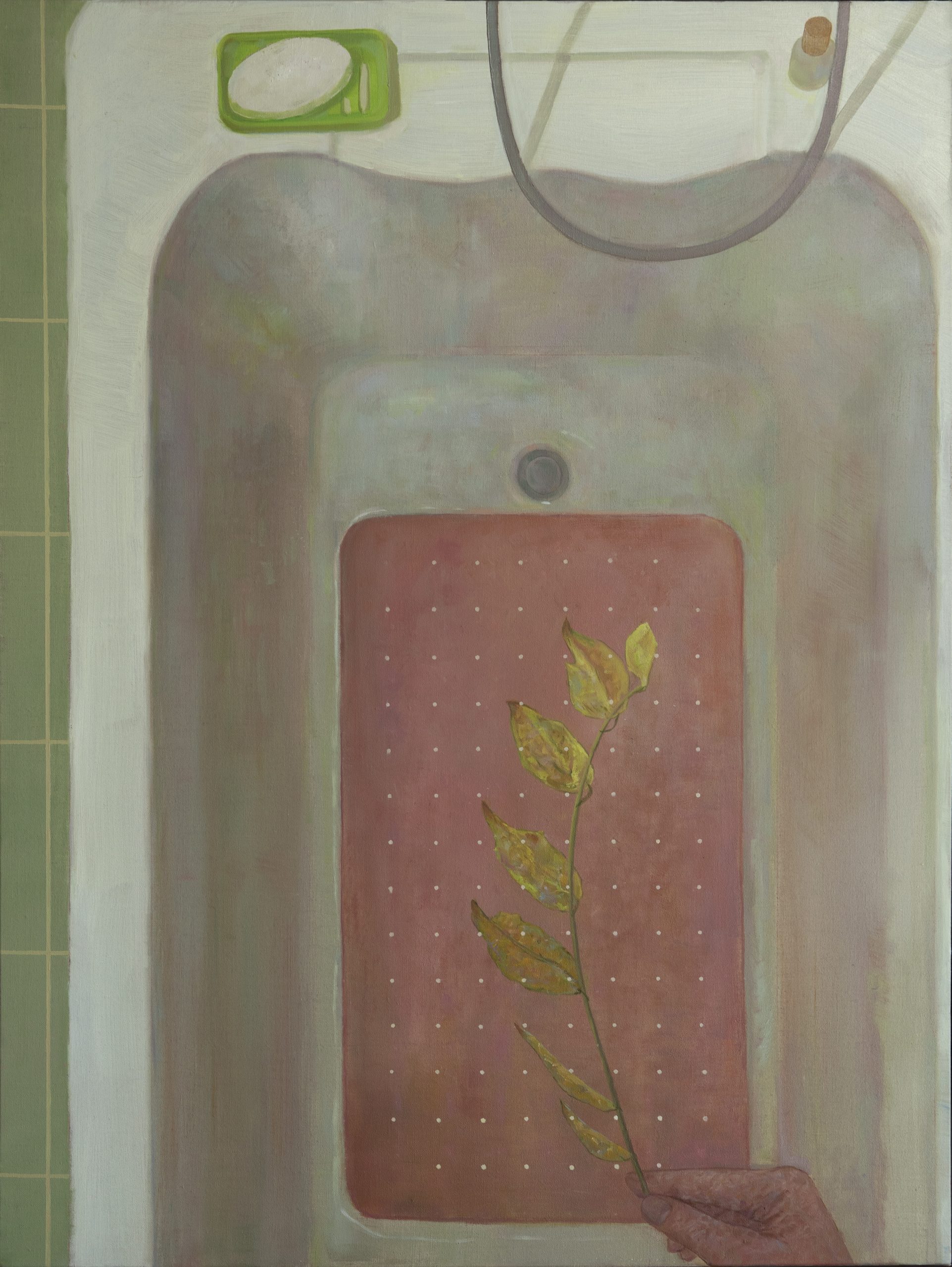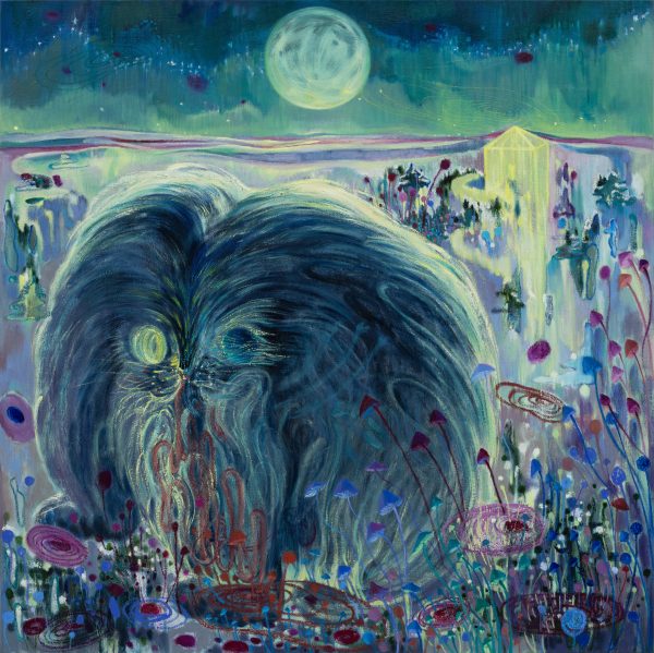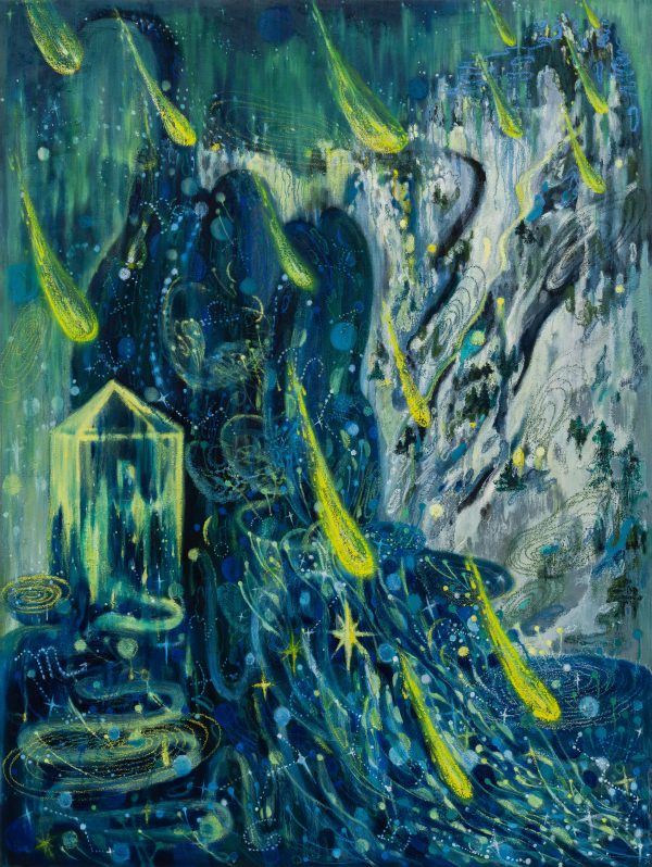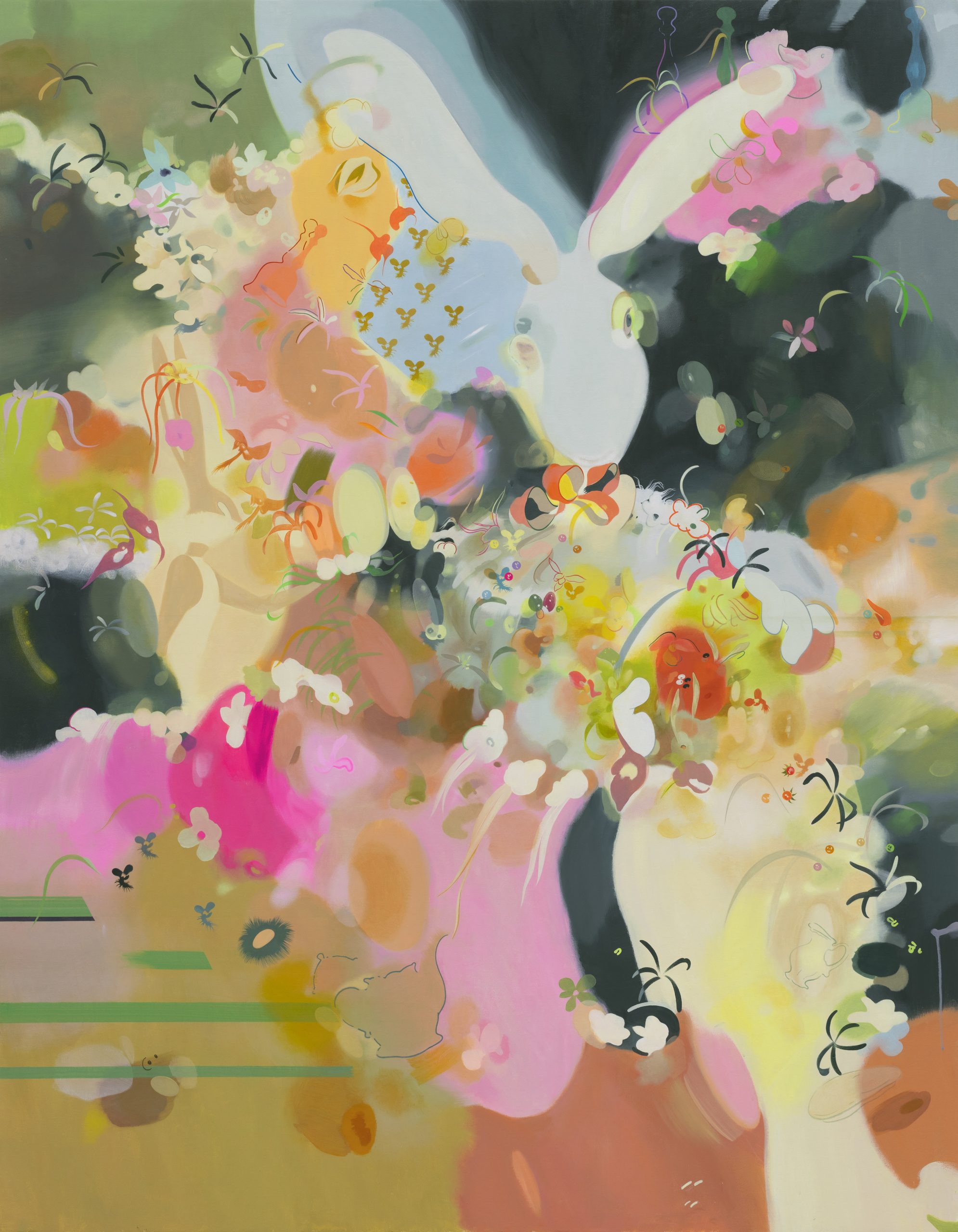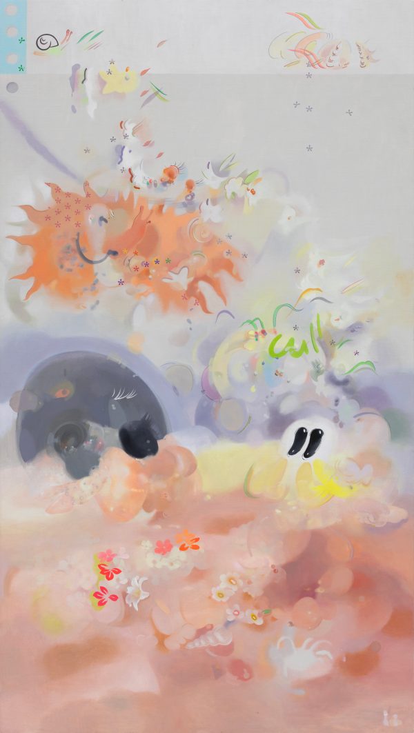 On the other side of the space, Zhang Jialei’s TOo is presented in the same line of sight as Wang Xinyan’s Spores of the Ninth Moon, where two distinctly different imaginaries of life unfold in dialogue. The former is light and intricate, with images that continuously split and grow across the canvas.; the latter, by contrast, builds a landscape of expanding organic life through dense yet fluid layers of color.“TOo” functions both as a homophone for “rabbit” in Chinese and as a reference to excess—an ever-accelerating rhythm that continuously spills beyond its limits. In contrast, Wang Xinyan’s work unfolds from the reproductive logic of fungi: spores drift through the air, initiating new cycles of growth. When dense clusters of spores hover in the atmosphere, light refracts through them, forming flowing bands reminiscent of the aurora. The “Ninth Moon” alludes both to the full moon of the fifteenth day of the eighth lunar month and to the nine-month cycle of gestation. The spread of fungi, the circulation of lunar phases, and the formation of the body intertwine here, composing a vision of life that oscillates between natural ecology and cosmic imagination.