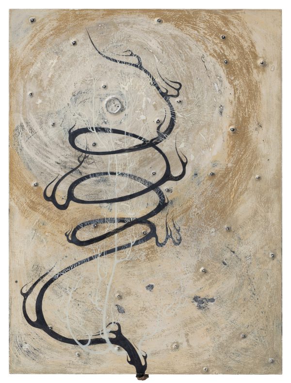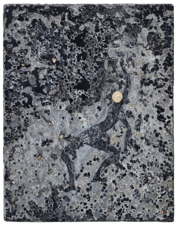 Myth and material, as sedimentary deposits of time, constitute the dual poles of Meng Zhou’s artistic universe. He perpetually seeks and excavates from these sources, observing their reciprocal stimulation and the chemical reactions that arise. As his consciousness meanders through the mythologies of Greece, the Norse, China, and many others, the artist’s body too never ceases to journey, encountering materials from diverse corners of the world. Whether it is a snail shell from Yemen, an Ankareena seed from South Africa, or minerals from the Sahara, Meng Zhou meticulously collects and accumulates. His obsession with these objects is not one of simple possession, but rather a means of casting them into new cycles of existence through his creative process. More crucially, through his tactile engagement with these materials, Meng Zhou contemplates and imagines the passage of time they have endured—on the surface of the earth, below its crust, and even beyond it. Varied wind speeds and humidity levels nurture and shape them, each possessing unique forms, yet all sharing elemental traits that hark back to ancient origins. Consequently, Meng Zhou’s painting process functions as a simulation of natural laws, with multiple materials accumulating like geological strata, layer upon layer. When gently abraded, they reveal fragmented maps upon which sparse brushstrokes depict fire, water, and human figures—traces etched in history, yet laden with the cryptic essence of future allegories.