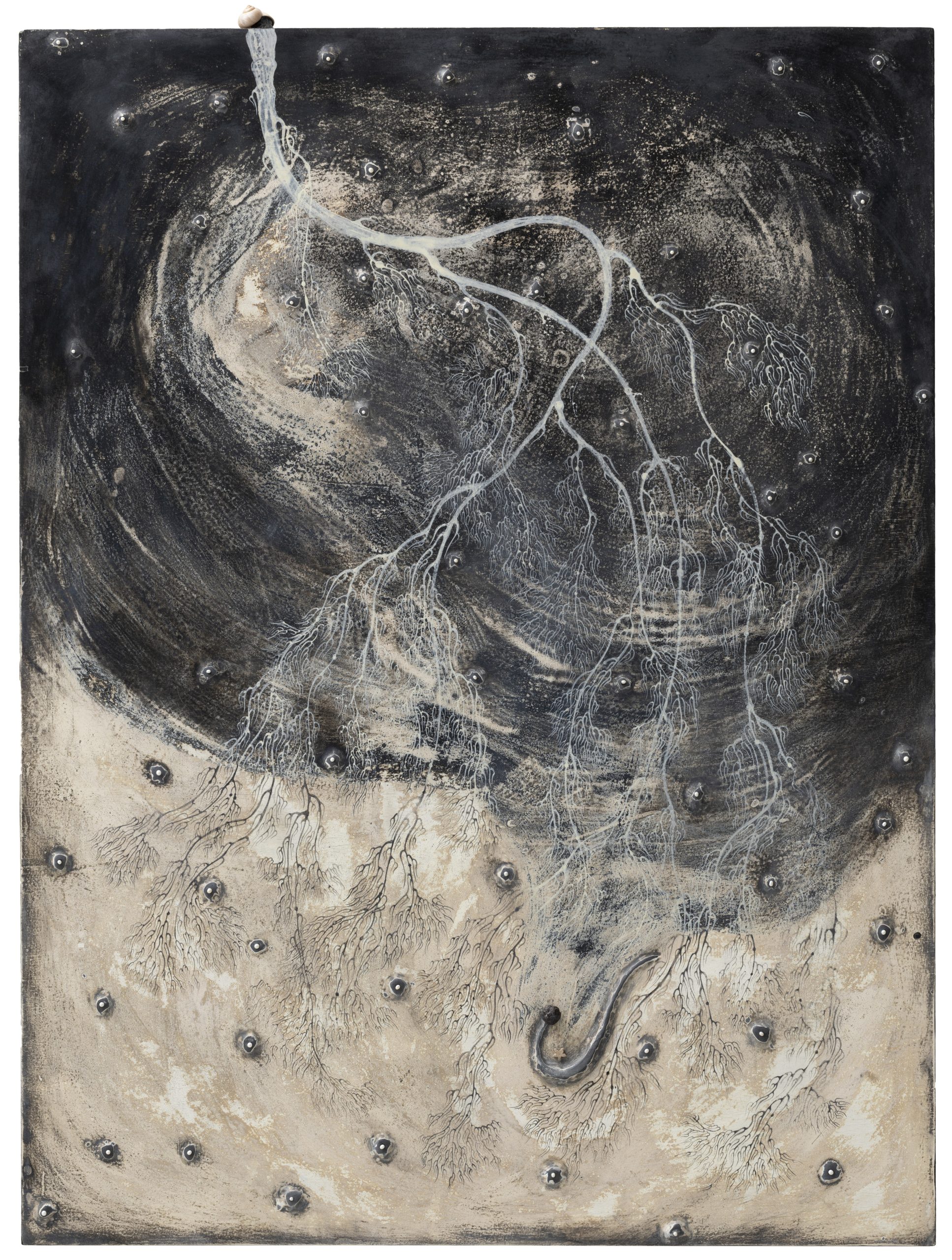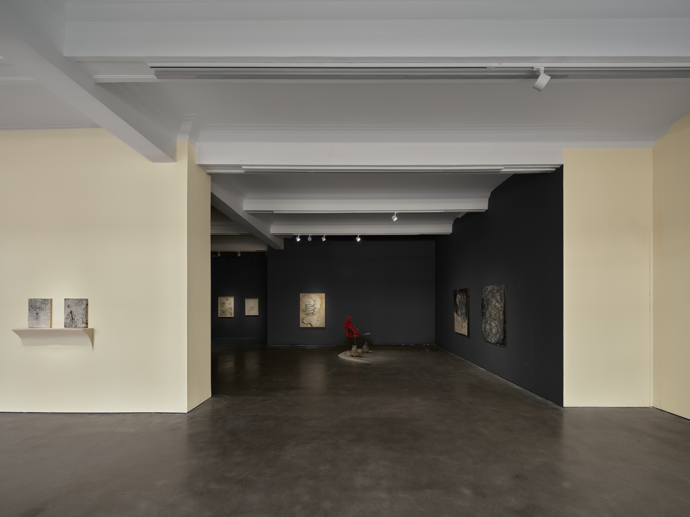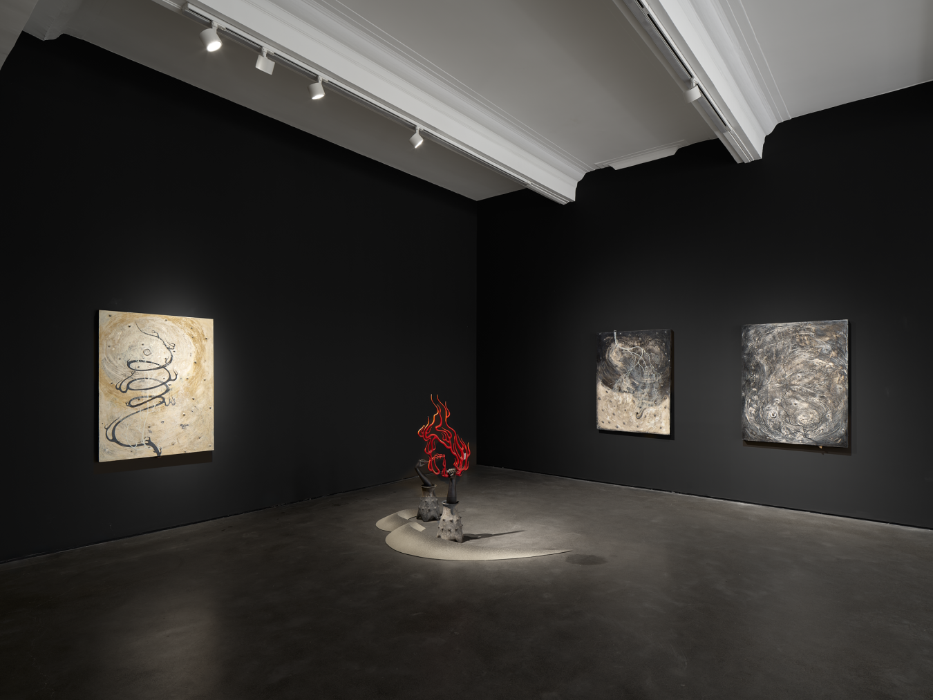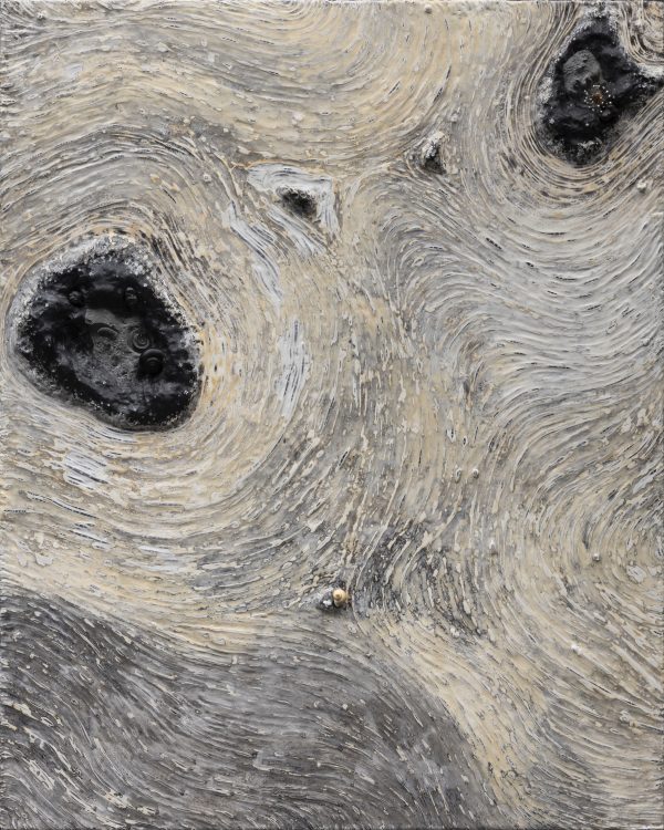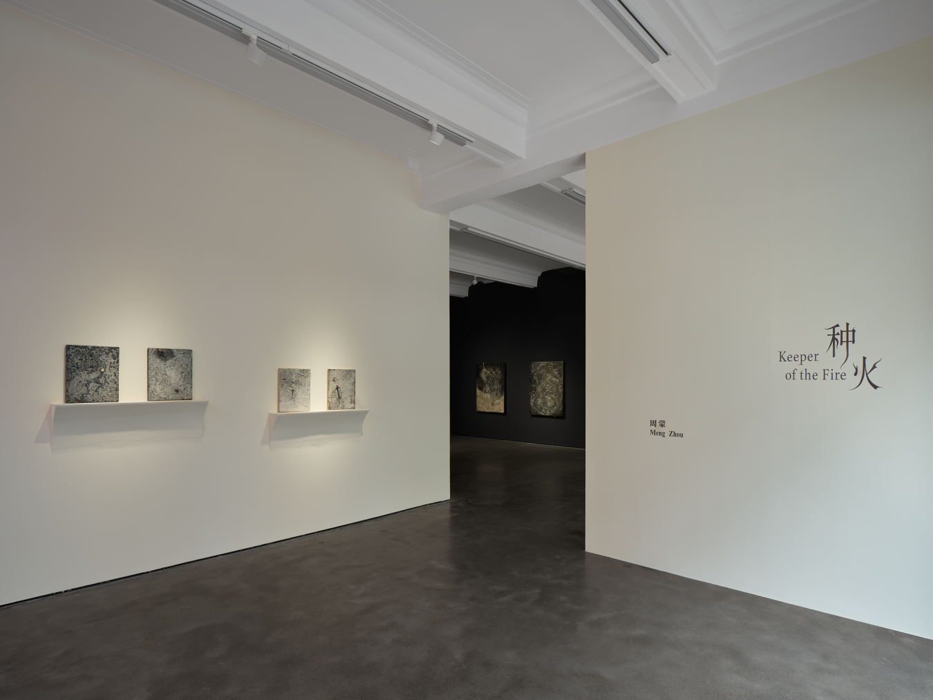 Myth and material, as sedimentary deposits of time, constitute the dual poles of Meng Zhou’s artistic universe. He perpetually seeks and excavates from these sources, observing their reciprocal stimulation and the chemical reactions that arise. As his consciousness meanders through the mythologies of Greece, the Norse, China, and many others, the artist’s body too never ceases to journey, encountering materials from diverse corners of the world. Whether it is a snail shell from Yemen, an Ankareena seed from South Africa, or minerals from the Sahara, Meng Zhou meticulously collects and accumulates. His obsession with these objects is not one of simple possession, but rather a means of casting them into new cycles of existence through his creative process. More crucially, through his tactile engagement with these materials, Meng Zhou contemplates and imagines the passage of time they have endured—on the surface of the earth, below its crust, and even beyond it. Varied wind speeds and humidity levels nurture and shape them, each possessing unique forms, yet all sharing elemental traits that hark back to ancient origins. Consequently, Meng Zhou’s painting process functions as a simulation of natural laws, with multiple materials accumulating like geological strata, layer upon layer. When gently abraded, they reveal fragmented maps upon which sparse brushstrokes depict fire, water, and human figures—traces etched in history, yet laden with the cryptic essence of future allegories.