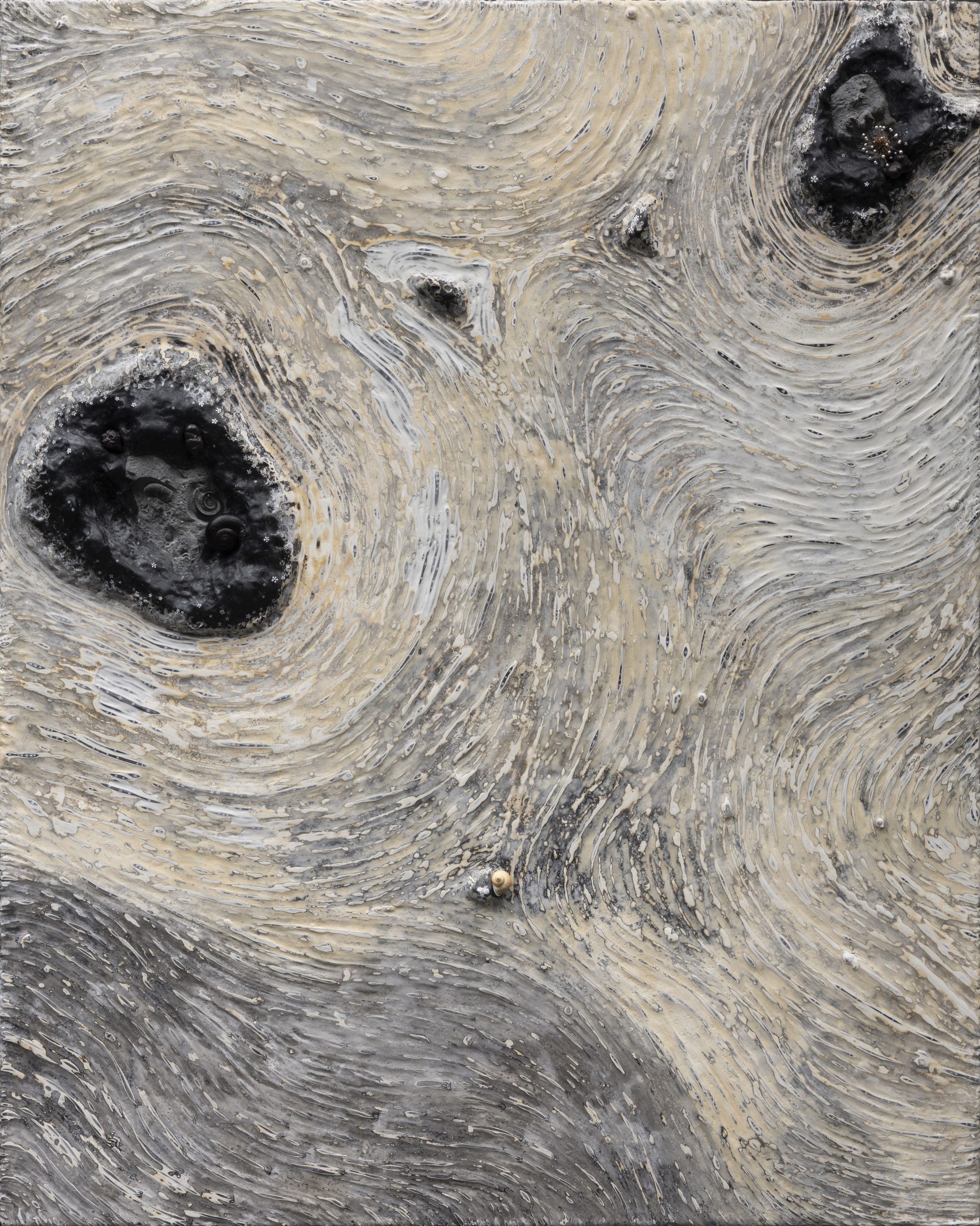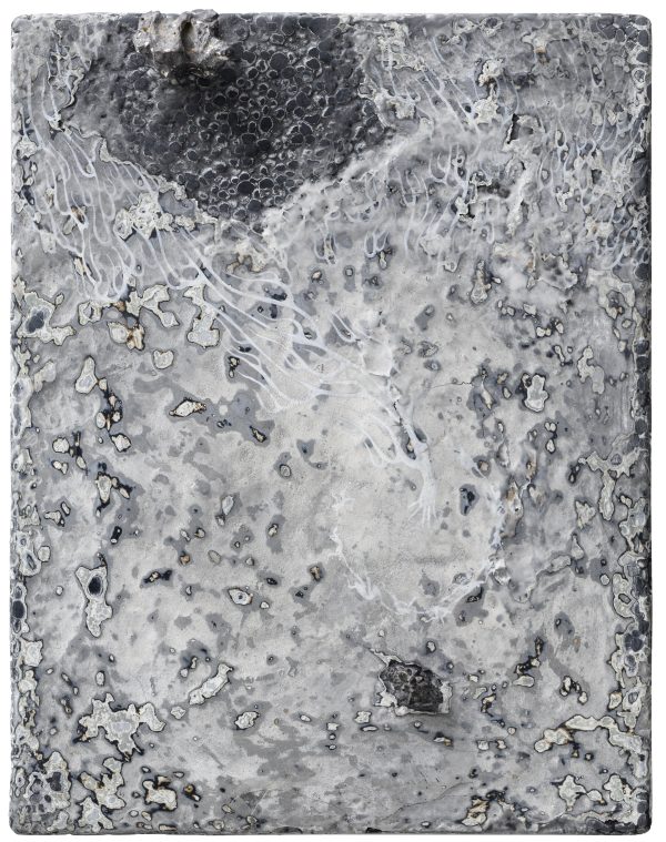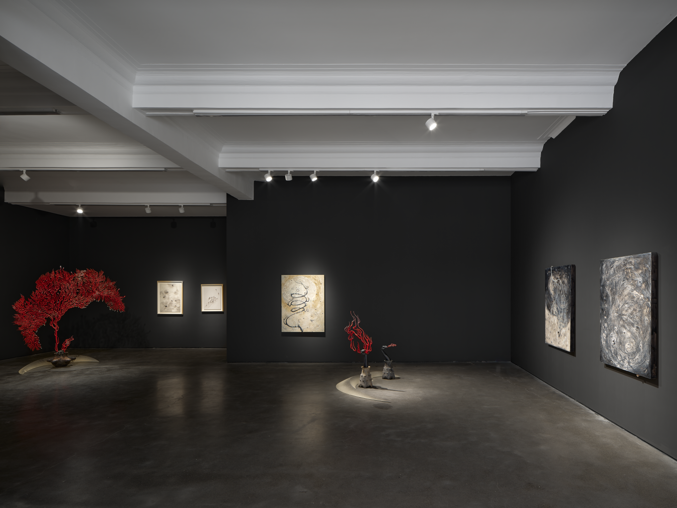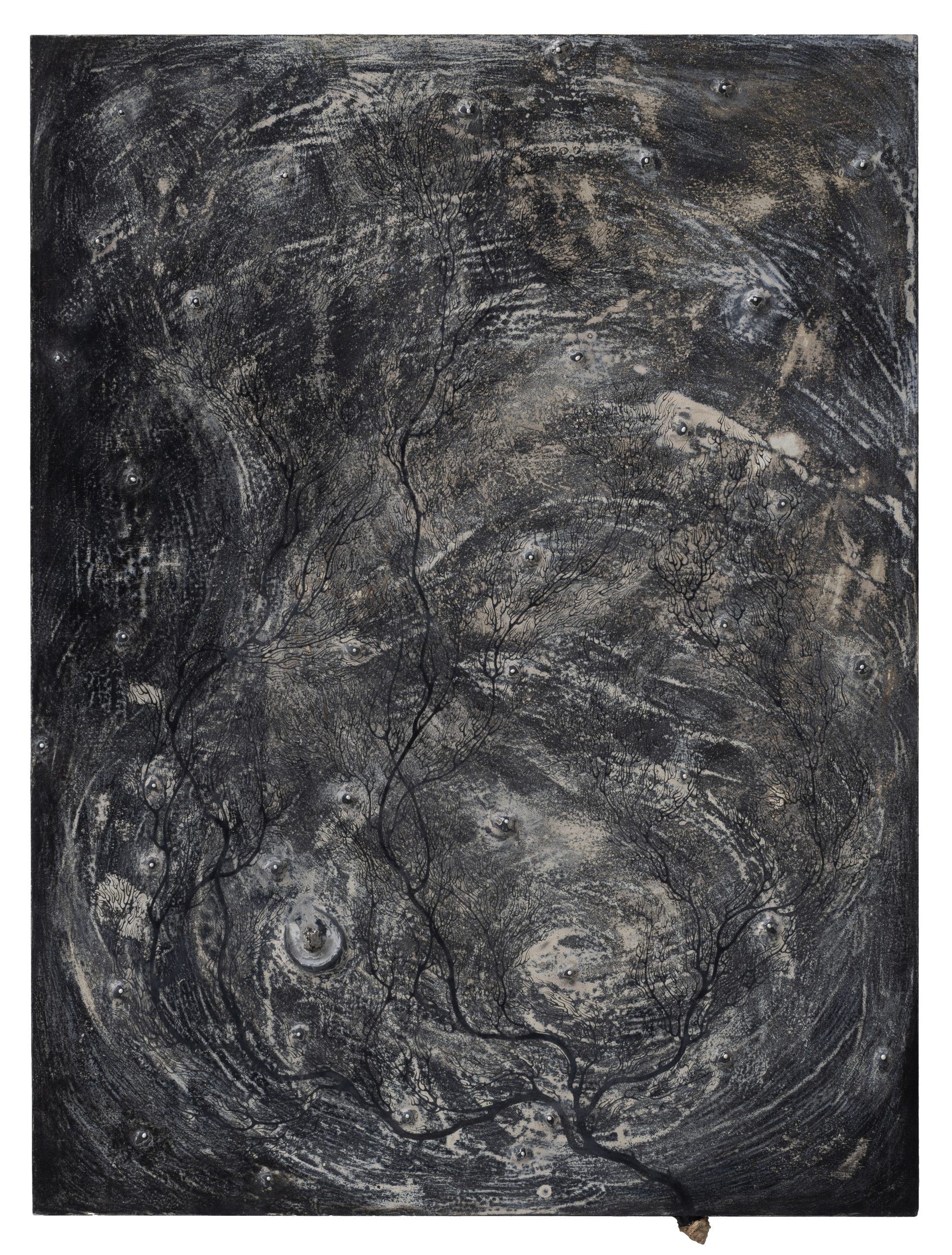 Myth and material, as sedimentary deposits of time, constitute the dual poles of Meng Zhou’s artistic universe. He perpetually seeks and excavates from these sources, observing their reciprocal stimulation and the chemical reactions that arise. As his consciousness meanders through the mythologies of Greece, the Norse, China, and many others, the artist’s body too never ceases to journey, encountering materials from diverse corners of the world. Whether it is a snail shell from Yemen, an Ankareena seed from South Africa, or minerals from the Sahara, Meng Zhou meticulously collects and accumulates. His obsession with these objects is not one of simple possession, but rather a means of casting them into new cycles of existence through his creative process. More crucially, through his tactile engagement with these materials, Meng Zhou contemplates and imagines the passage of time they have endured—on the surface of the earth, below its crust, and even beyond it. Varied wind speeds and humidity levels nurture and shape them, each possessing unique forms, yet all sharing elemental traits that hark back to ancient origins. Consequently, Meng Zhou’s painting process functions as a simulation of natural laws, with multiple materials accumulating like geological strata, layer upon layer. When gently abraded, they reveal fragmented maps upon which sparse brushstrokes depict fire, water, and human figures—traces etched in history, yet laden with the cryptic essence of future allegories.