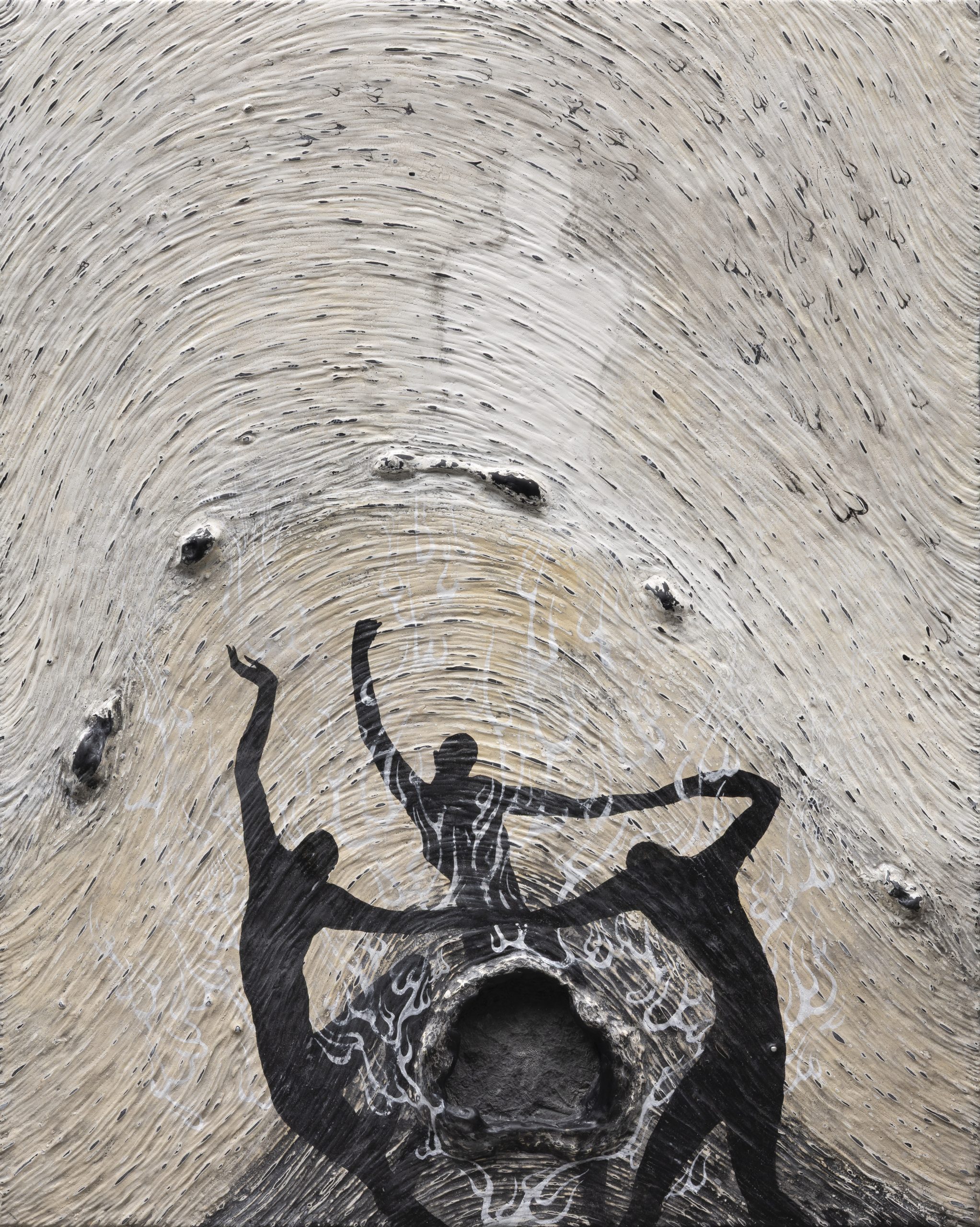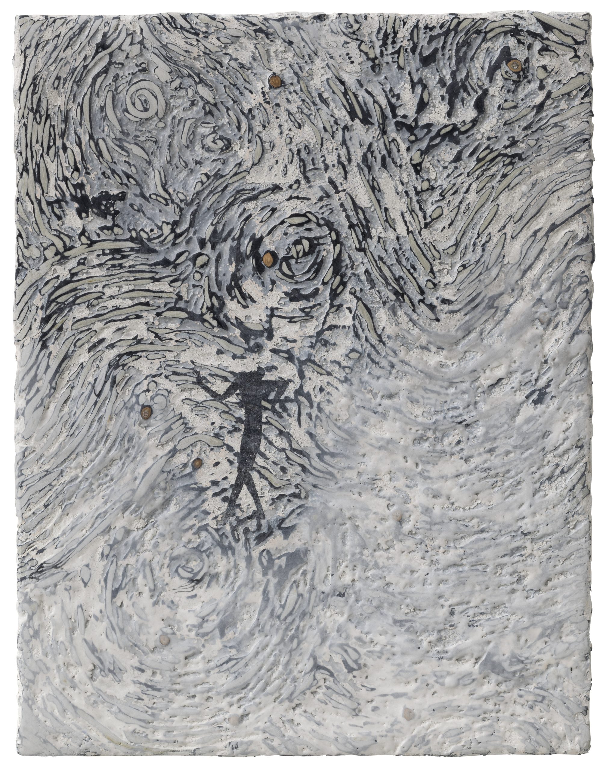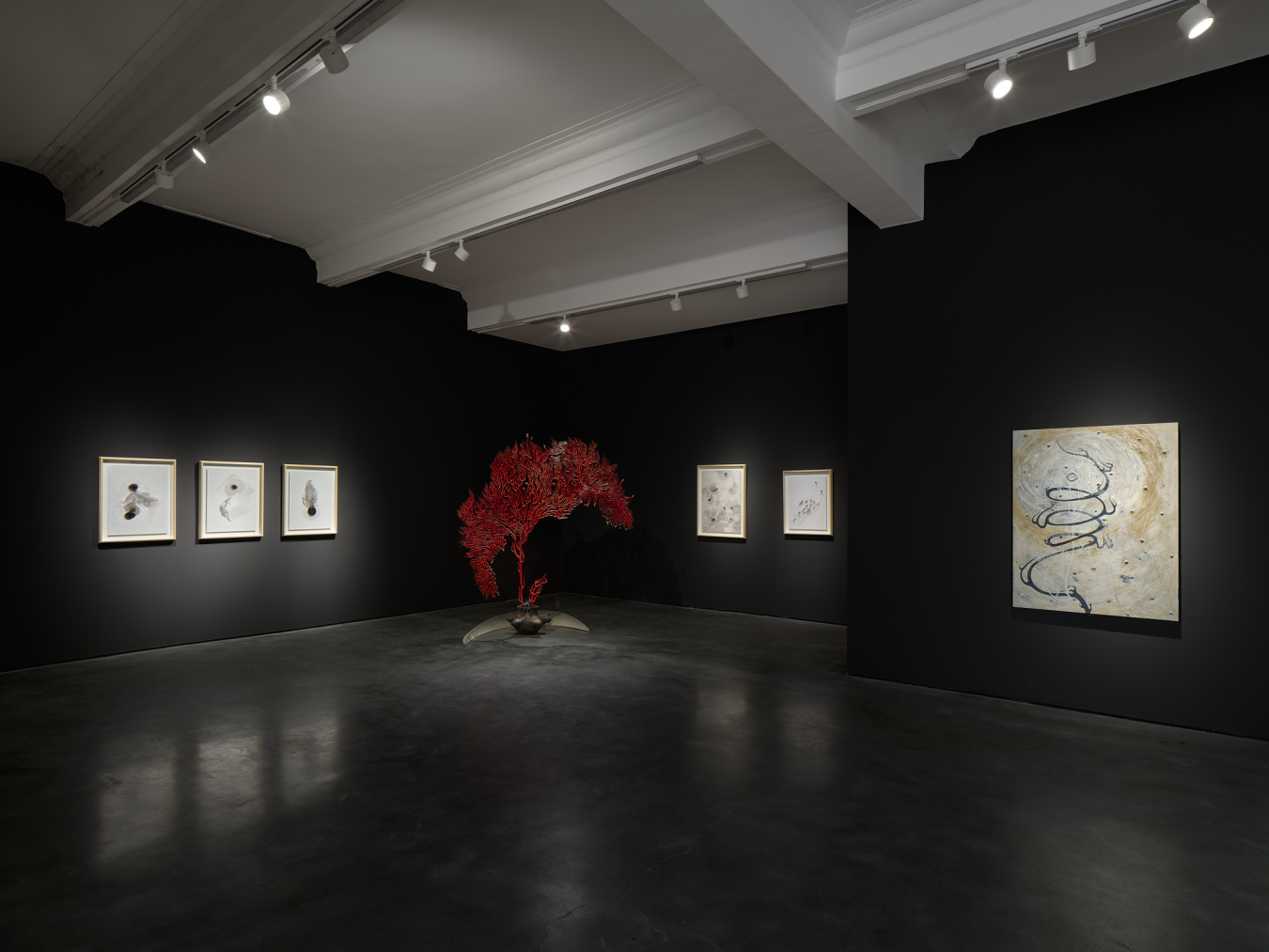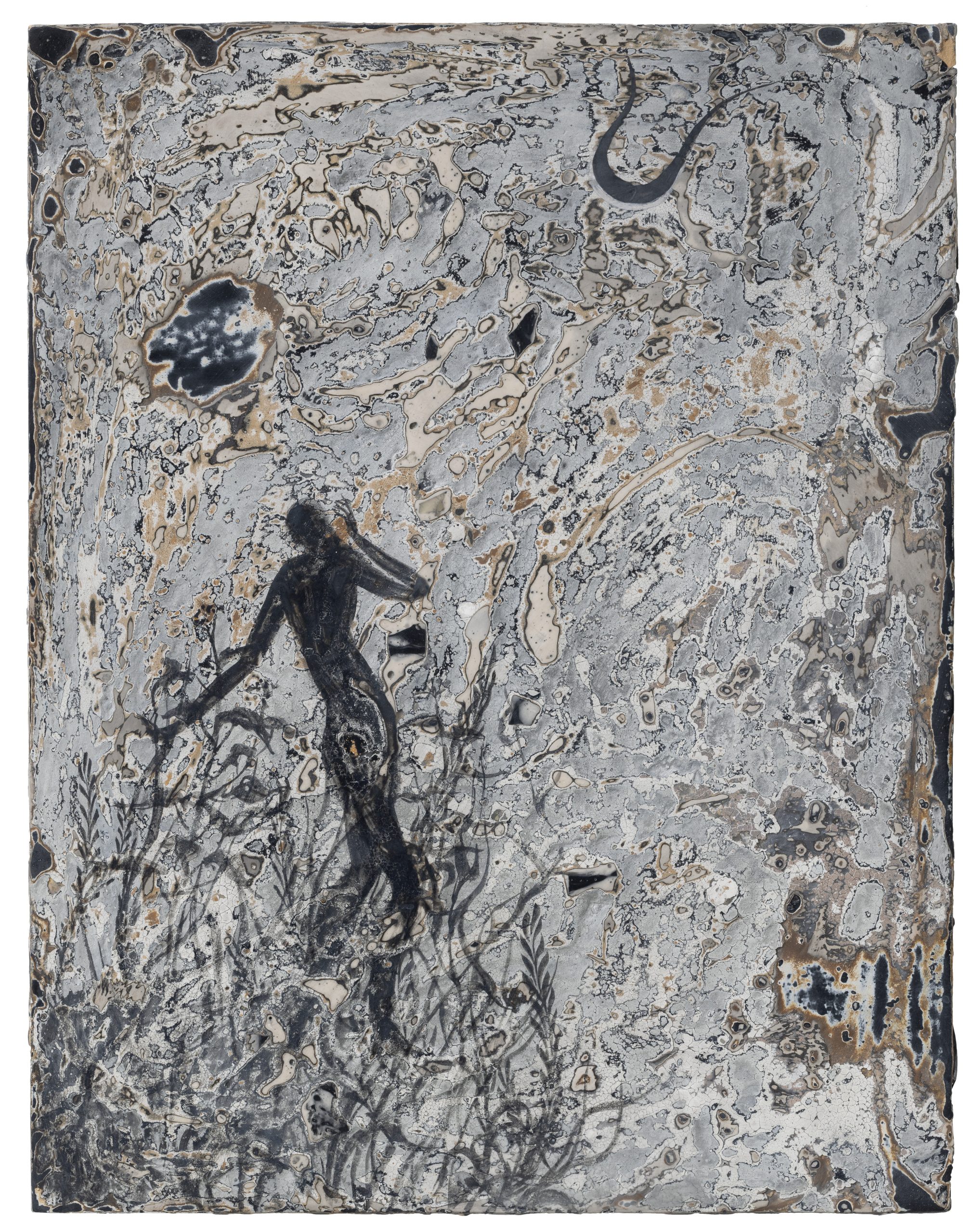 Myth and material, as sedimentary deposits of time, constitute the dual poles of Meng Zhou’s artistic universe. He perpetually seeks and excavates from these sources, observing their reciprocal stimulation and the chemical reactions that arise. As his consciousness meanders through the mythologies of Greece, the Norse, China, and many others, the artist’s body too never ceases to journey, encountering materials from diverse corners of the world. Whether it is a snail shell from Yemen, an Ankareena seed from South Africa, or minerals from the Sahara, Meng Zhou meticulously collects and accumulates. His obsession with these objects is not one of simple possession, but rather a means of casting them into new cycles of existence through his creative process. More crucially, through his tactile engagement with these materials, Meng Zhou contemplates and imagines the passage of time they have endured—on the surface of the earth, below its crust, and even beyond it. Varied wind speeds and humidity levels nurture and shape them, each possessing unique forms, yet all sharing elemental traits that hark back to ancient origins. Consequently, Meng Zhou’s painting process functions as a simulation of natural laws, with multiple materials accumulating like geological strata, layer upon layer. When gently abraded, they reveal fragmented maps upon which sparse brushstrokes depict fire, water, and human figures—traces etched in history, yet laden with the cryptic essence of future allegories.