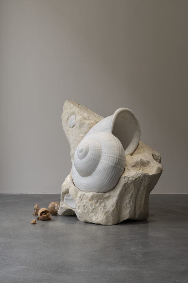 This is the miraculous world Meng Zhou subtly constructs through a series of sculptures, a model where familiar stories vaguely resurface. In Greek mythology, fire is stolen by Prometheus and gifted to humankind, a transgression for which he is eternally punished, with an eagle devouring his liver. Yet in Meng Zhou’s reimagining, both Prometheus and the eagle vanish, replaced by a snail shell, repeatedly pecked by a bird until punctured, echoing the ancient myth in the natural world. This shell thus becomes the container for the unknown stories and life cycles yet to be born.