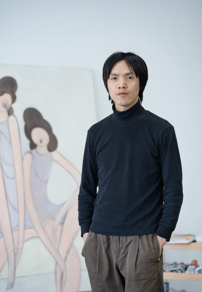 “我们既非向东,亦非向西,而是向内;因为在我们的灵魂深处,藏蕴着神圣的本体,那是我们真正的家园。”这段来自民国学者吴经熊的文字,为季鑫近年的创作提供了一种幽微而确切的精神指引。从身处居所中的女性形象,到维纳斯、美惠三女神、洛神与纳西索斯等“她者”意象的借用,他持续在作品中投射对“神圣本体”的体认。形象逐步从叙事和神话中抽离,转向一种更为朴素的审美转化。此次展出的作品中,早期绘画中具象的居室背景被有意识的削弱,转而引入雕塑结构与建筑线条,以及柱式、波纹、星月等秩序性元素。这一转化不仅拓展了观看的维度,也将凝望从私密空间中解放出来,指向一种更为抽象、宏观、通向本体的观看方式。