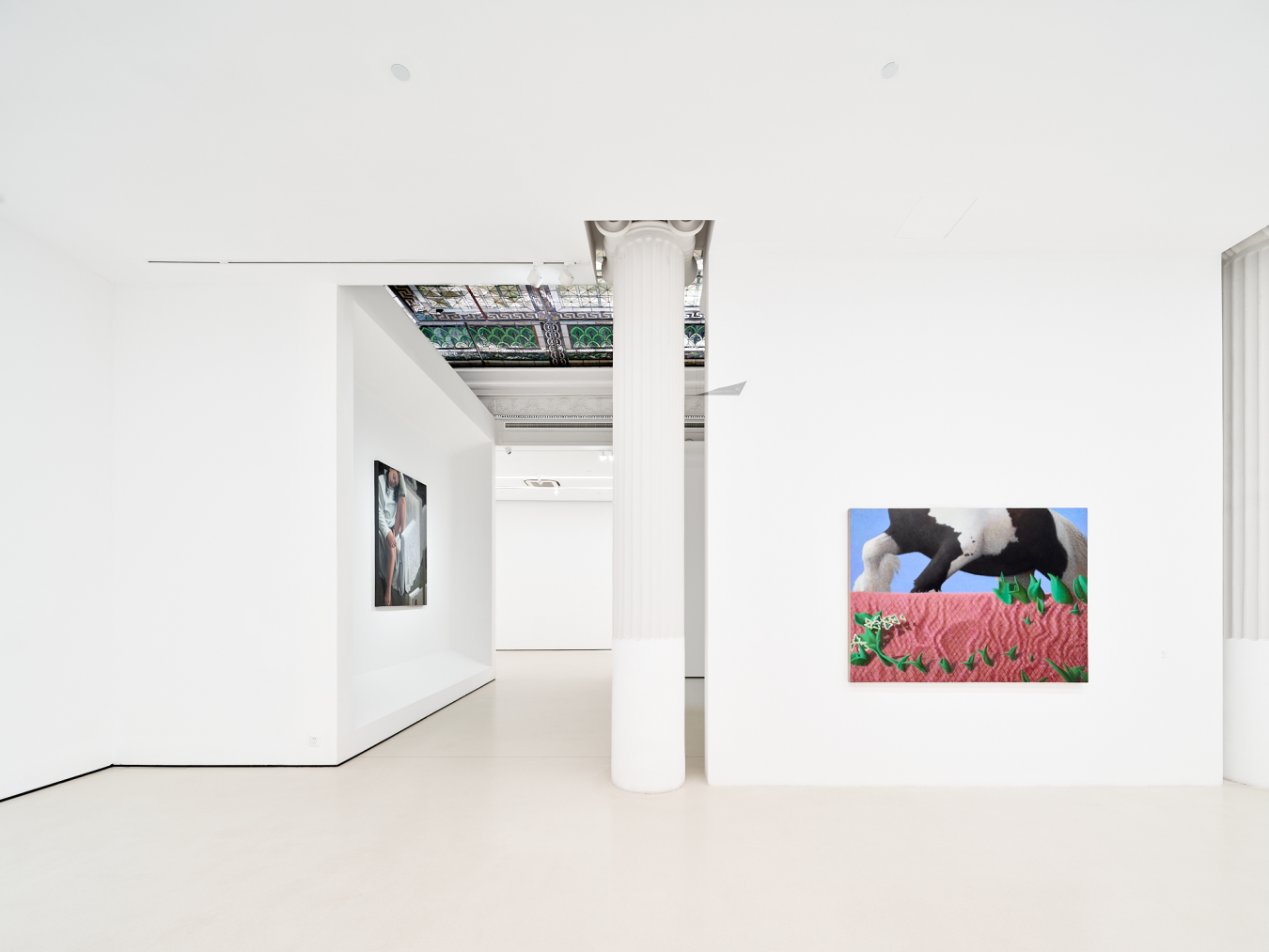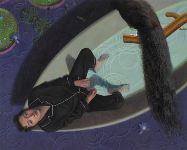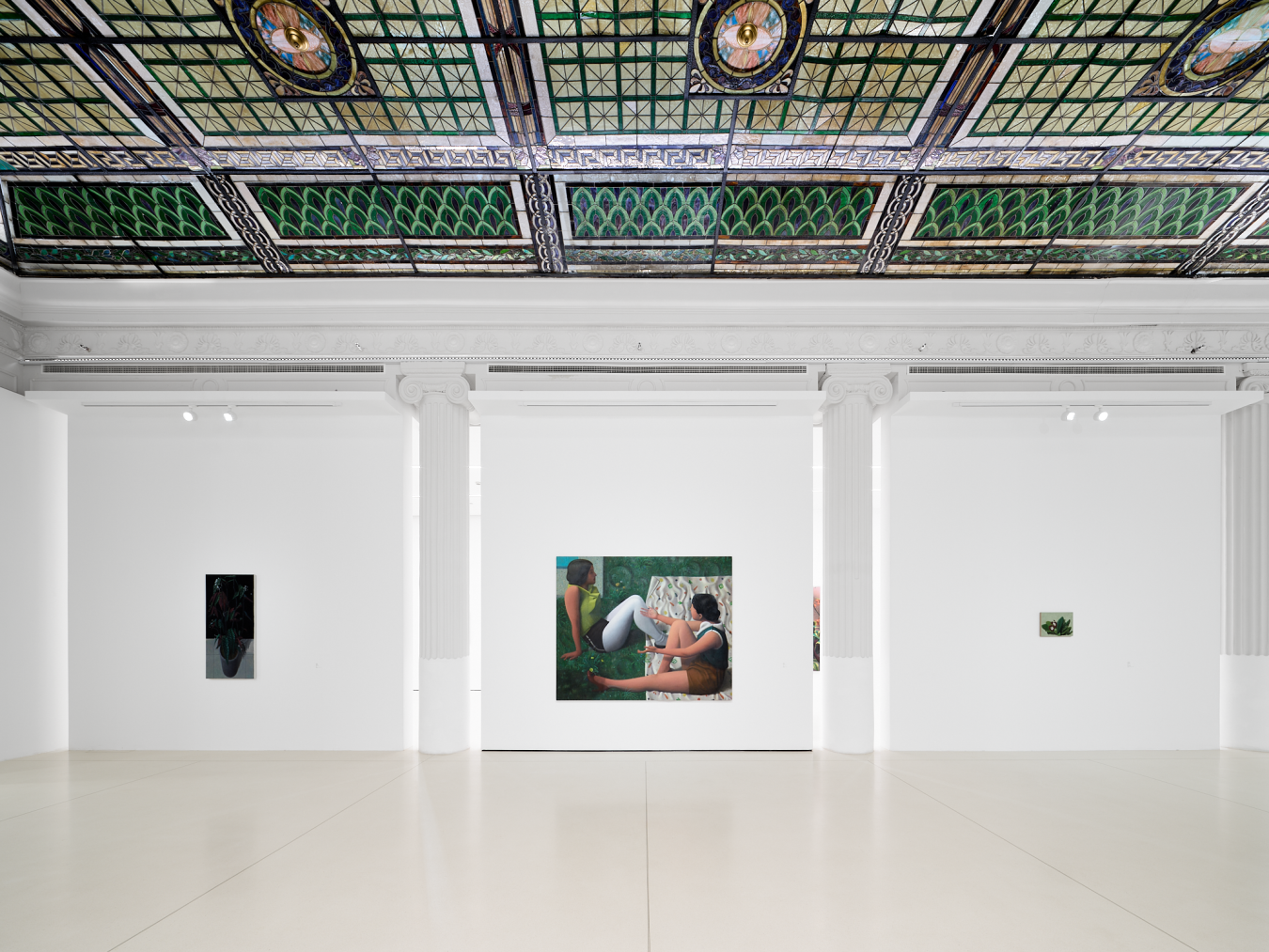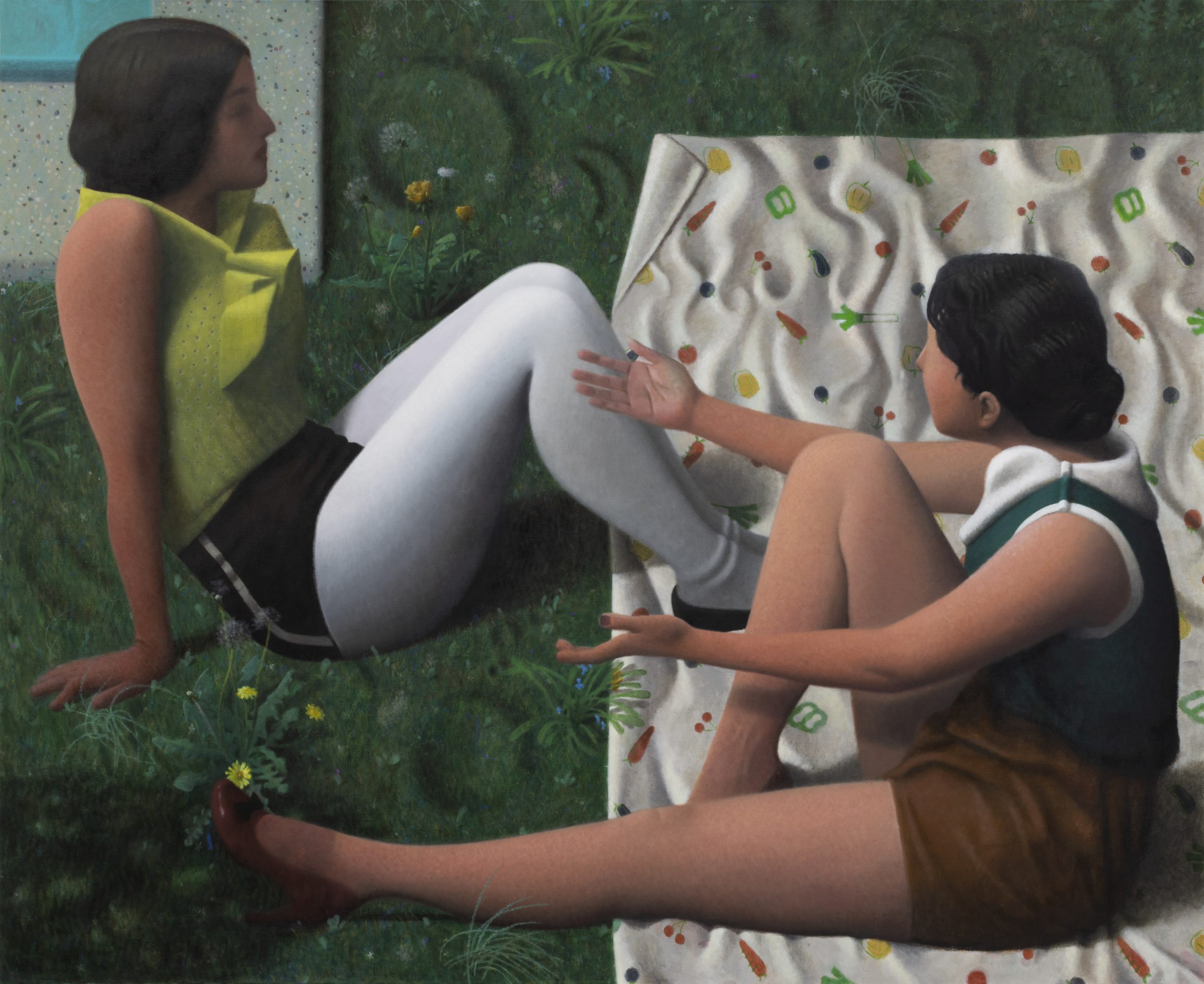 卢豫的绘画并不满足于单一的象征或线性叙事,通过对多重图像的拆解、错位与重组,营造一种审美上的悬置,使观者在不确定与多义的间隙反复游弋。她以女性艺术家的共感思维和敏锐视角重新介入艺术史中的若干母题,消解既定的符号秩序,释放高浓度的情感能量。如果说艺术家于2024年创作的“Europa”引发了新作中的叙事转折,将主角从传统叙事的被动身份中抽离,转而强调动物性的温顺与神性的魅惑。那么与“大浴女”母题关联的俯卧天使,有意削弱对面目的凝视,使观看机制发生本质位移。而孔雀与男性形象的并置,则与艺术史中惯常的“女性与鹦鹉”所指向的欲望意涵形成鲜明反照。借由“草地上的午餐”这一题材,卢豫不再诉诸外部指涉,而是将叙事内化为对日常生活的自足体认,从而打破了传统图像叙事的惯例与既有的观看模式。