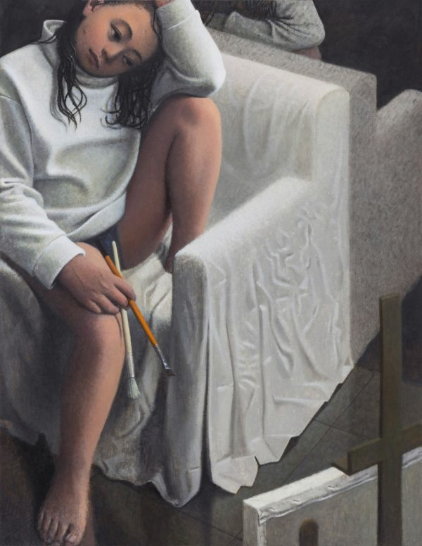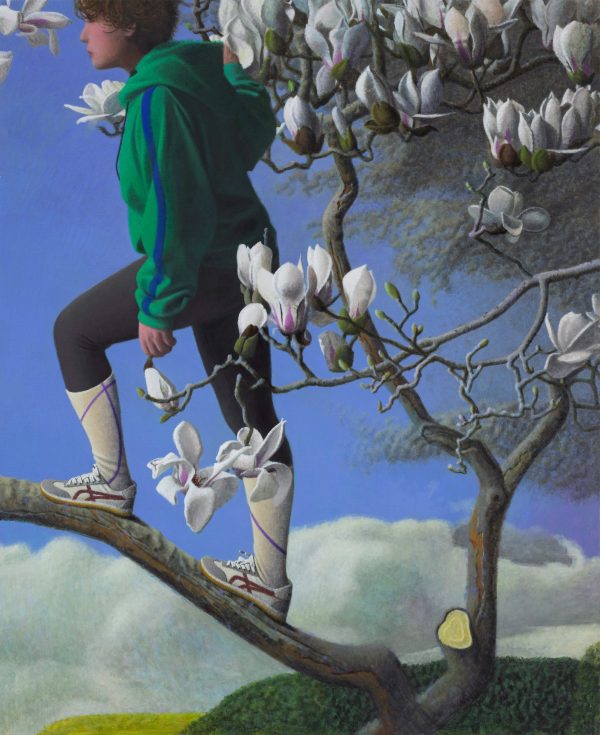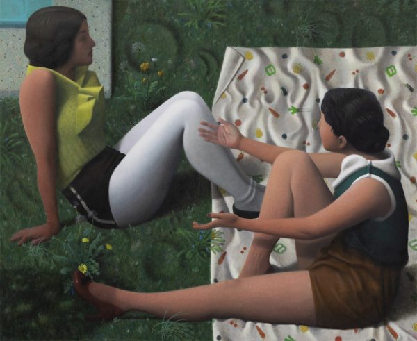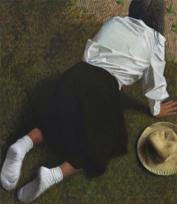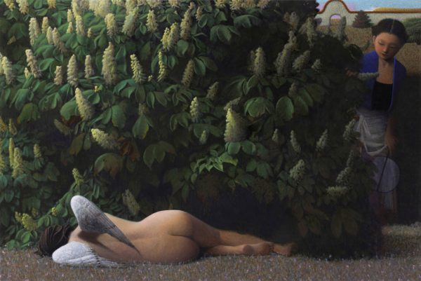 艺术家的绘画实践摆脱了高度集中的视觉牵引,在柔韧有度的氛围中扭转感知,赋予画面人物全然不同的精神质地。“梦途”正是沿着这样的叙事轨迹不断延展、交织和弥散,而田园主义及其内蕴的与宇宙秩序之间的协奏,则为她提供了重要参照和坐标,使其抵达精神的降熵,抵御成长过程中不断涌现的外部混乱(Chaos)与内在焦灼。田园、牧场与花园成为她托载个人意识和具身叙事的根基和土壤。卢豫在绘画中构筑的高度秩序化的图景,与她在现实世界的真切体验交相呼应,从而有效避免秩序化世界的溶解与坍塌。意识在安定的画面结构中不断出离与折返,却始终指向一个她理想中的伊甸或桃源。“梦途”照见了她穿行于随时开启的门扉之间的多重分身,借由人物、图式和嵌套式的空间,释放出独特而开放的语义。在流动的视线与层叠的时间中,观者与画面中的分身聚合,悄然步入艺术家织构的柔性世界,直至无尽的沉湎。